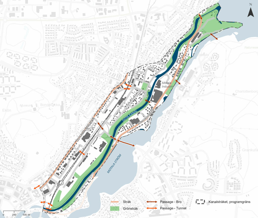 I Motala fick vi möjlighet att testa vår kunskap och kompetens och undersöka hur Motalas kanalstråk kan förändras utifrån sina kulturhistoriska värden för att bidra till Motalas framtida utveckling. En kulturmiljöanalys för programområdet togs fram tillsammans med Stina Hagelqvist, byggnadsantikvarie och arkitekturhistoriker samt Jakob Pontén som bidrog med planerarperspektiv.