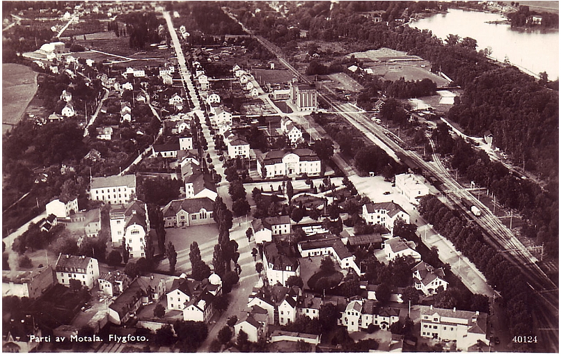 Äldre vykort över Östermalmsgatan med Järnvägsparken och Järnvägsstationen till höger och de äldre numera rivna, stadskvarteren i förgrunden.