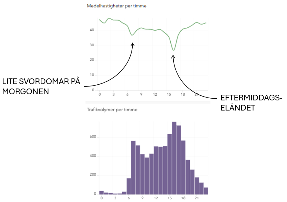 Men det som är intressantare för den som vurmar hållbart resande är vad vi gör med kunskapen. Tittar vi på det här urklippet från Traffic Insights ser vi därnere i bilden trafikmängderna som den klassiska M-kurvan som toppar på morgonen och eftermiddagen. Vi ser samtidigt att det här drar ner hastigheten under samma tider.